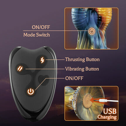 Smooth insertion with a tapered beak-shaped tip and heightened friction from raised circular ridges. Experience deeper penetration with a large helical ridged shaft. Enjoy a momentary respite with a slimmed waistline, while thrill-seekers revel in the raised spherical knot. Plus, the feathered bottom tantalizingly caresses your entrance.